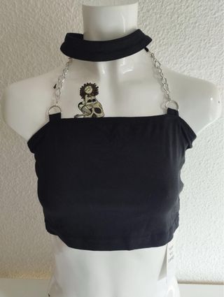 Crop top negro con detalle de cadenas y choker. - Diseño moderno y atrevido. - Cadenas plateadas. - Cuello estilo choker.