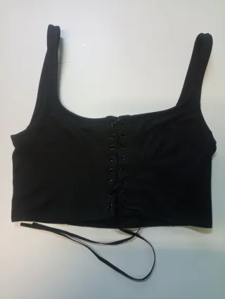 Top estilo corsé de Bershka en color negro. Diseño moderno y favorecedor. - Escote pronunciado. - Cierre de cordones en la parte delantera. - Tirantes anchos.