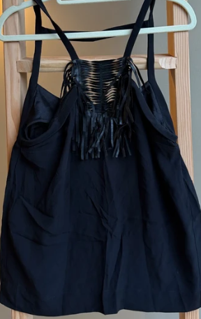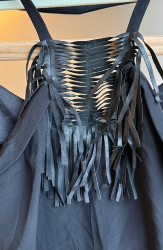 Top negro con un diseño único en la espalda. - Detalle de flecos en la parte superior. - Tirantes finos.
