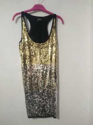Vestido corto con un diseño degradado de lentejuelas doradas a plateadas. El top es de estilo nadador en color negro. - Lentejuelas brillantes. - Diseño degradado.