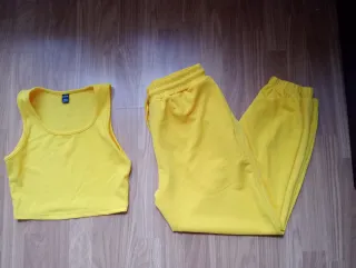 Conjunto deportivo de dos piezas. - Top tipo camiseta sin mangas. - Pantalón largo con cintura elástica y cordón.