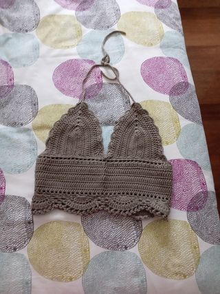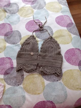 Top de crochet hecho a mano. - Diseño halter. - Tejido calado. - Tiras para atar al cuello y espalda.
