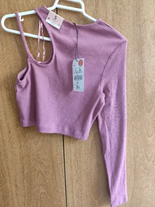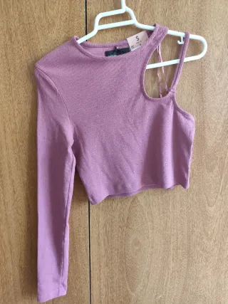 Camiseta crop top de manga larga con un diseño asimétrico y moderno. Es color rosa como se ve en la última imagen - Tejido de canalé. - Escote redondo. - Corte crop top.