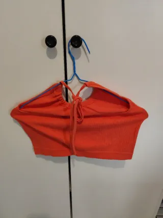 Top de tejido acanalado con diseño halter. - Tirantes finos para atar al cuello. - Escote pronunciado. - Corte cropped.