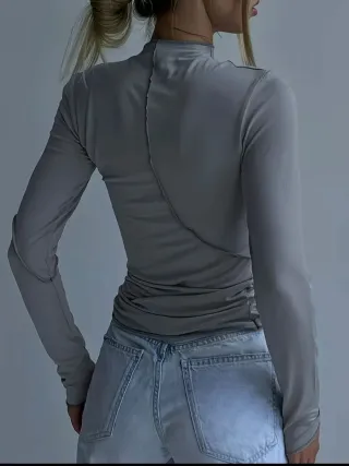 Top de manga larga con un diseño moderno y favorecedor. - Corte asimétrico con costuras expuestas. - Fruncido lateral para un ajuste ceñido. - Cuello alto. #asimetrico #topmangalarga #top #jersey #camisetamangalarga #ceñido