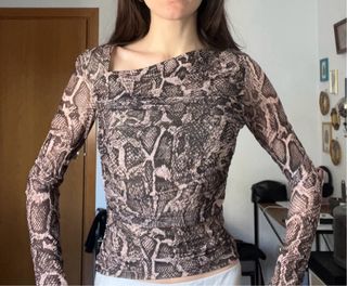Top de manga larga con estampado de serpiente. - Diseño con escote asimétrico. - Tejido semitransparente. - Estampado en tonos marrones y rosados.