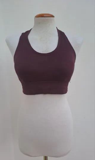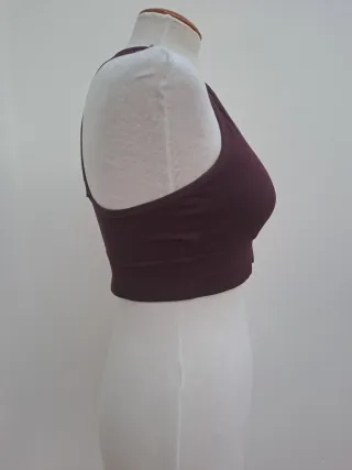 Top deportivo de color granate, ideal para actividades físicas. - Diseño halter. - Banda elástica en la parte inferior.