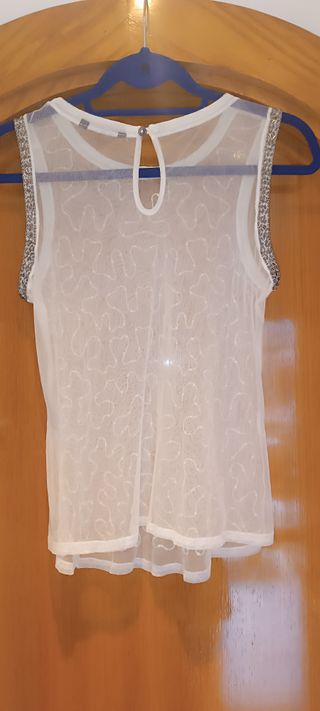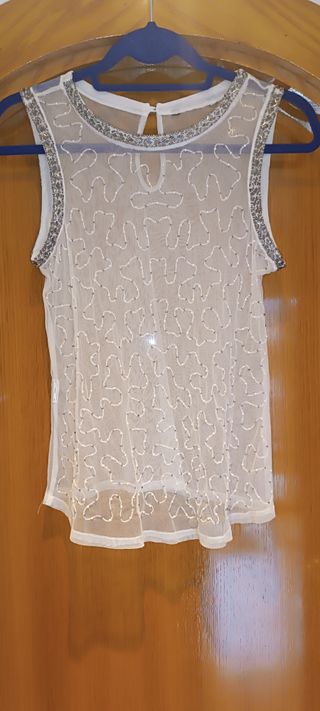 Elegante top con un diseño de pedrería que aporta un toque brillante. - Adornado con pedrería plateada. - Diseño sin mangas. - Escote redondo con detalle de pedrería. - Cierre con botón trasero - Puesto una vez