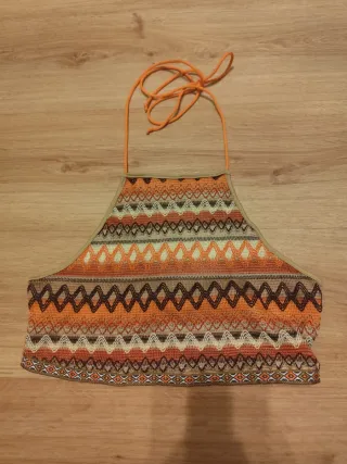 Top corto con un diseño étnico. Perfecto para añadir un toque bohemio a tu estilo. - Patrón geométrico en tonos naranjas y marrones. - Tirantes finos para atar al cuello. - Tejido ligero y cómodo.