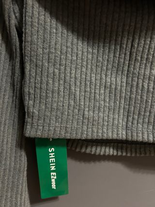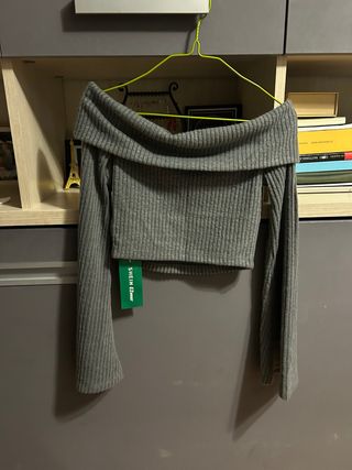 Top gris de SHEIN con escote Bardot. - Tejido acanalado. - Mangas largas acampanadas. - Corte cropped.