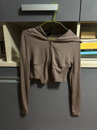 Top corto de manga larga con un diseño moderno y favorecedor. La tela acanalada le da un toque texturizado y elegante. - Cierre de cremallera frontal. - Capucha integrada. - Diseño tipo corsé en el busto.