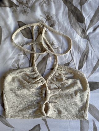 Este top de verano es perfecto para lucir un estilo fresco y moderno. - Diseño con textura. - Tirantes finos. - Cierre de lazada frontal. - Color blanco roto.