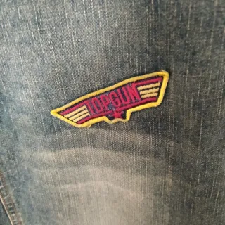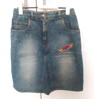 - Falda vaquera, divertida joya vintage original de los años 80, con parche delantero película TOP GUN. - Marca Red Way. Talla 36/S - Parches traseros distintivos de la marca R(ed) y W(ay) + logo estrella repetido en botón de metal de la falda. - El desgastado es el propio característico del denim. - Bolsillos delanteros y traseros. - Corte clásico 80s entallado a la cintura. - Está impecable a pesar de los años.