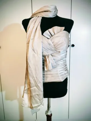 Elegante conjunto de top de fiesta y pañuelo a juego, confeccionado en tela satinada. - Top con escote cruzado y detalles de pliegues. - Pañuelo largo y vaporoso. - Color beige gris dorado.