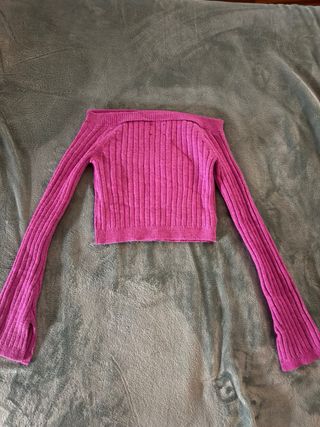 Top banda rosa con manga larga y detalle de pedrería. - Diseño de hombros descubiertos. - Mangas acampanadas con aberturas. - Tejido de canalé.