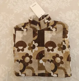 Top de Bershka con un llamativo estampado floral y geométrico. - Diseño de cuello alto. - Tejido de pana fina con textura acanalada. - Tonos marrones y beige. - Zona lumbar descubierta.