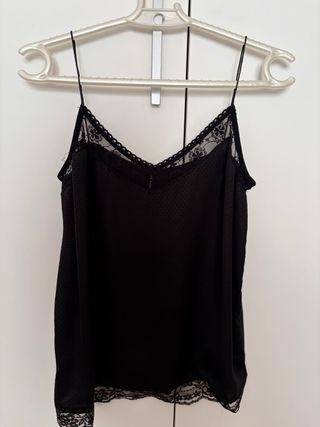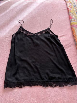 Elegante top lencero con tirantes ajustables y detalles de encaje. - Tejido satinado. - Adorno de encaje en escote y bajo. - Tirantes finos y regulables.