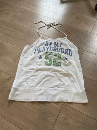 Top blanco con un divertido estampado. - Diseño AT MY PLAYGROUND. - Número 52 en verde y azul. - Bolsillo frontal. - Tiras para atar al cuello.