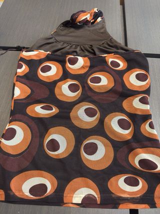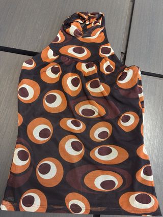 Top con cuello halter y estampado llamativo. - Diseño con círculos concéntricos en tonos marrones y naranjas. - Tejido ligero y transparente.