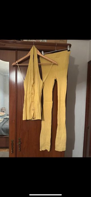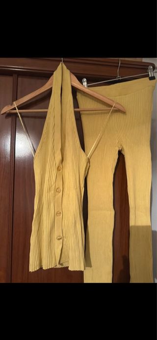 Conjunto de dos piezas de Zara. - Top estilo halter con botones. - Pantalón largo acampanado.