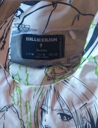 Camiseta de manga larga con un diseño llamativo de estilo anime que combina personajes y motocicletas. - Estampado integral con detalles en verde. - Cuello redondo. - Mangas largas. Billie eilish
