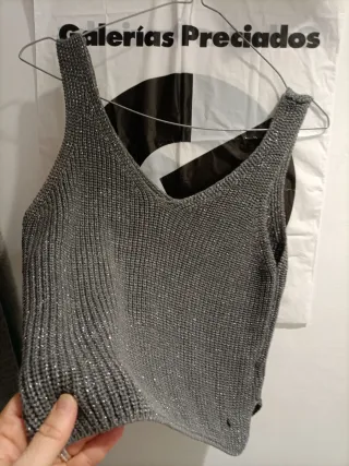 Bonito top de tejido lana gris con hilos plateados. - prenda muy combinable, tanto para interior o para llevar prendas por debaho y lucirlo por encima..variedad de posibilidades según el ingenio. - Diseño de tirantes. - Escote en pico. - Tejido con acabado brillante.