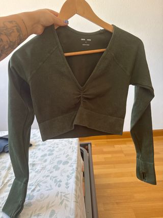 Top deportivo de manga larga con escote en pico y detalle fruncido en el pecho. El tejido es acanalado y elástico. - Diseño ajustado. - Puños con abertura para pulgar.