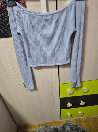 Este top de manga larga es perfecto para un look moderno y cómodo. Su diseño de hombros descubiertos le da un toque chic. - Tejido acanalado. - Puños con botones decorativos. -Color lila azulado