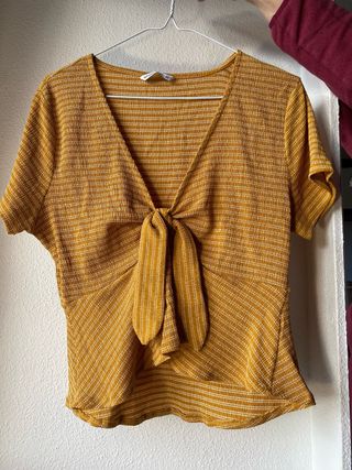 Top de manga corta con un diseño moderno y favorecedor. Su tejido texturizado y el detalle del nudo en la parte delantera le dan un toque especial. Es talla L pero equivale mas bien a una M - Escote en V. - Nudo frontal. - Tejido con textura.