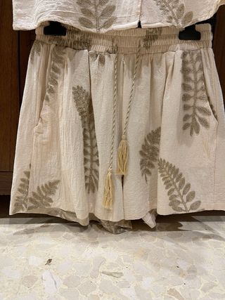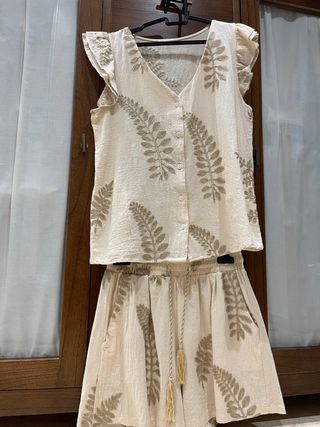 Conjunto de dos piezas con estampado de hojas. - Top con cuello en V y manga corta. - Shorts con cintura elástica y cordón. - Diseño con estampado de hojas en dorado. Puesto dos veces. yo utilizo talla M y me viene acopladito