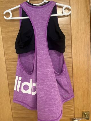 Conjunto de camiseta deportiva y top. - Camiseta de tirantes morada con logo grande. - Top deportivo negro.