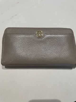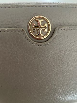 Monedero de la marca Tory Burch en color gris. Presenta un diseño elegante y funcional. - Cierre de cremallera. - Detalle de logo metálico en la parte frontal.