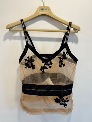 Elegante top lencero con detalles de encaje floral. - Tejido de tul transparente. - Detalle de banda negra en la cintura. - Tirantes finos con adornos. nuevo con etiqueta. talla S-M