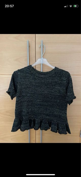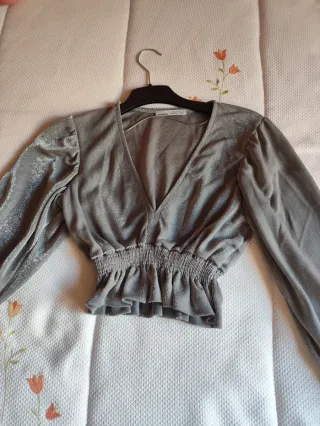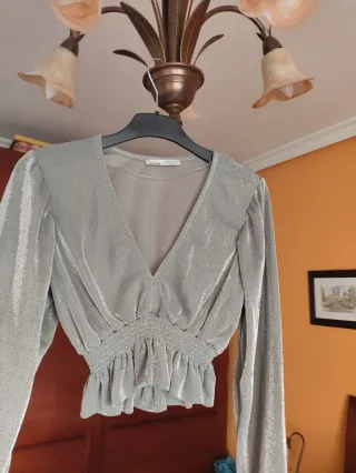 Top de manga larga con un acabado brillante y detalles elásticos en la cintura. Talla S. Medidas en las fotos. Muy poco uso. - Escote en pico. - Bajo con volantes. - Tejido plateado con destellos.