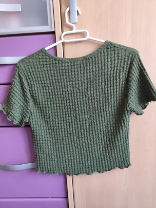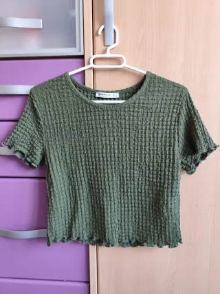 Camiseta de Stradivarius, en color verde oliva Los bajos de las mangas y el bajo de la prenda tienen un acabado ondulado crop top manga corta talla M
