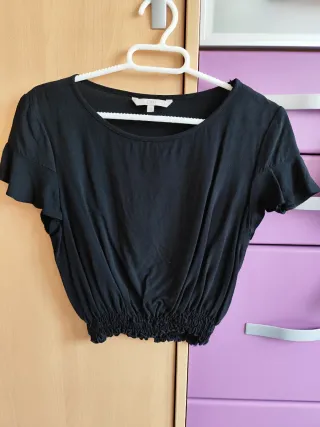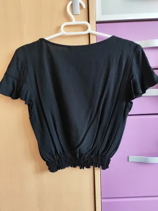 Top negro de C&A con un diseño moderno y favorecedor. - Manga corta con volantes. - Cintura elástica fruncida para un ajuste cómodo. - Cuello redondo. - Talla M - Corte crop top