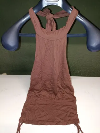 Top marrón estilo halter, perfecto para un look casual. - Diseño con tirantes que se anudan al cuello. - Detalle fruncido en la parte inferior. - Cordones ajustables en los laterales.