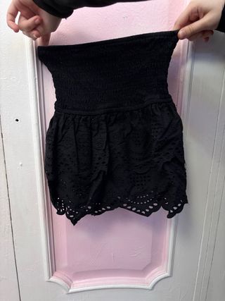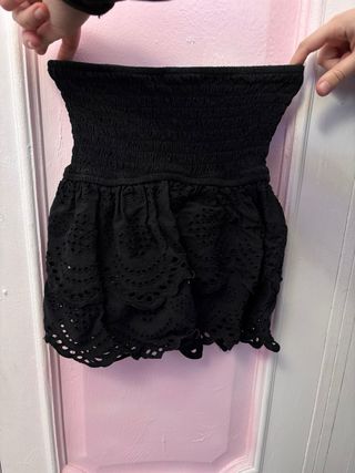 Precioso top negro de Stradivarius con un diseño de bordado. - Cuerpo elástico fruncido. - Falda con detalle de bordado inglés. - Bajo con acabado festoneado.