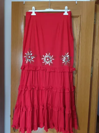 Conjunto de falda y top con detalles de pedrería. - Falda con adornos de pedrería en el bajo. - Manga al codo. - Cinturón de tela a juego.