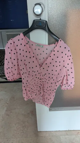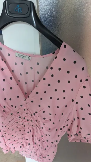 Preciosa blusa crop top con estampado de lunares. - Diseño cruzado con fruncido. - Mangas cortas abullonadas. - Escote en V.