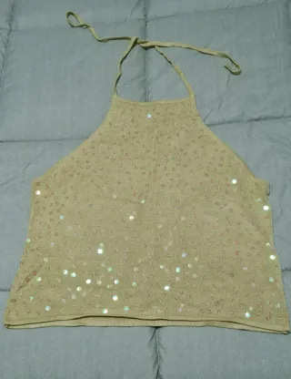 Top de H&M hecho con cuentas brillantes. Perfecto para destacar en cualquier ocasión y deslumbrar con mucho brillo. - Diseño con tirantes y acabado plateado por fuera y dorado por dentro. - Se cierra con una cadena atrás - Talla XS/S Completamente nuevo, sin estrenar y con etiqueta. Me lo compré porque me gustaba mucho, pero nunca lo he usado. 📍 Entrega en mano en Collado Villalba o envío.