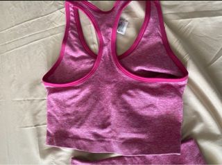 Top deportivo de la marca Gymshark en color rosa. Diseño cómodo y moderno. - Tejido elástico y transpirable. - Tirantes cruzados en la espalda. - Logo de la marca en el pecho. - Talla S