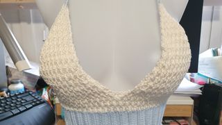 Top exclusivo tejido a mano con diseño tipo deportivo, pero con un aire sexy y original. Combinación preciosa de beige y azul cielo, con espalda cruzada ajustable. ¡Sienta de maravilla y es comodísimo! Perfecto para looks aparentemente inocentes, pero atrevidos en el fondo. 🧶 Hecho a mano con mucho mimo. ✨ Pieza única. No hay dos iguales.