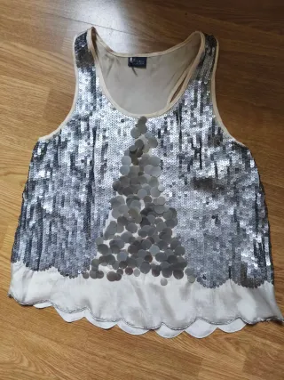 Top con lentejuelas plateadas de diferentes tamaños en la parte delantera. El bajo es de tela satinada color crudo con un borde festoneado. Liso por detrás. Está intacto, muy fino, con las costuras perfectas. Adquirido en USA hace unos años, es único.