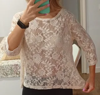 Precioso top con delicado tejido semitransparente en encaje con flores y plumeti. - Manga tres cuartos. - Corte holgado. - Se puede lucir solo o también queda muy bonito dejándose ver bajo prendas de pico o escote haciendo contraste, como se puede apreciar en la última foto