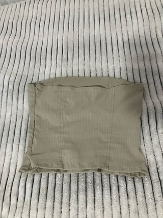 Top beige con un diseño de rayas verticales finas. Es un top sin tirantes, ideal para combinar. - Diseño de rayas verticales. - Estilo sin tirantes.