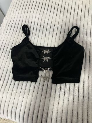 Top de terciopelo con detalle de mariposas metálicas en el escote. - Diseño con tirantes finos. - Abertura frontal con adornos. - Tejido suave y elástico.