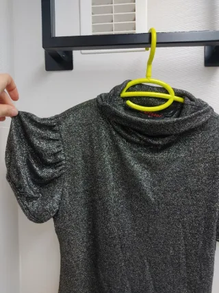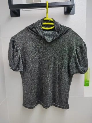 Top gris oscuro con tejido brillante efecto lurex. Mangas cortas abullonadas y cuello alto suave. Muy cómodo y el tejido estira. Perfecto para cenas, Navidad o eventos. #topbrillante #fiesta #lurex #navidad #mangaabullonada