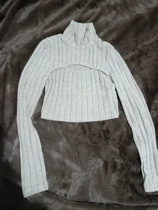 Este top corto de cuello alto es una prenda versátil y moderna. - Diseño de canalé. - Abertura en la zona del pecho. - Mangas largas.
