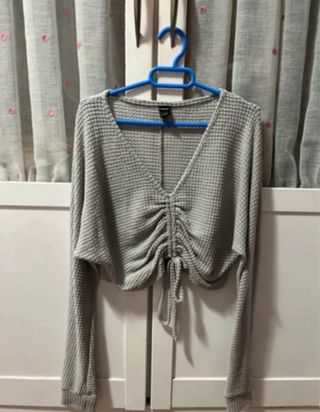 Top gris de manga larga con un diseño fruncido y ajustable en la parte delantera. - Tejido tipo gofre. - Escote en V. - Cordón para ajustar el fruncido.